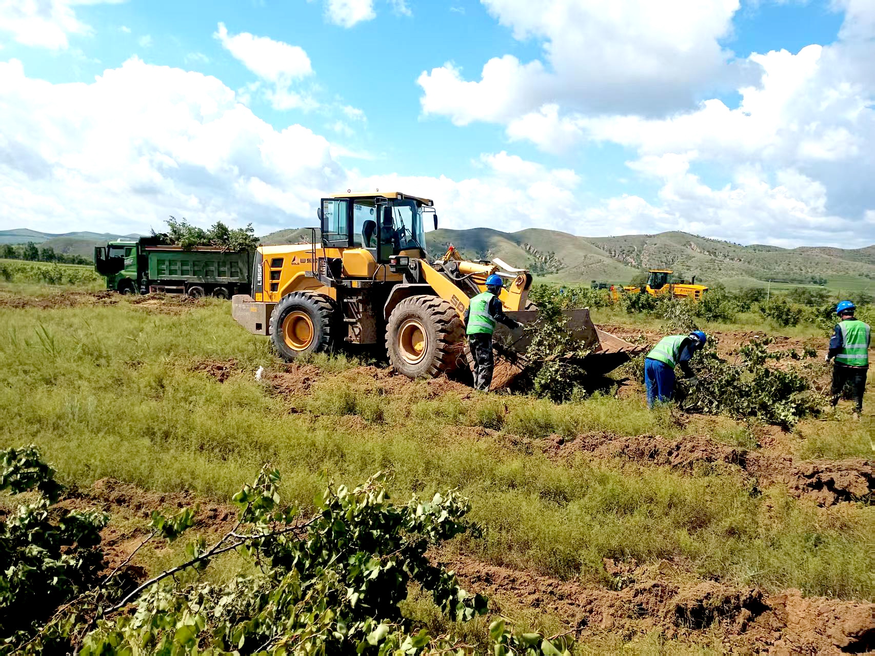 隨著一聲響亮的開工號令,多臺大型機械同時啟動:挖掘機揮動長臂進行地基開挖。